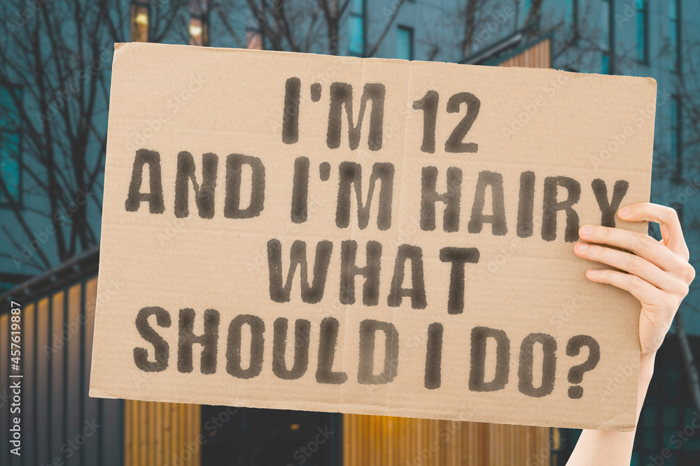 The question " I'm 12.and. I'm hairy. What should I do? " on a banner in men's hand with blurred background. Kids. Healthcare. Psychology. Puberty. Pubertation