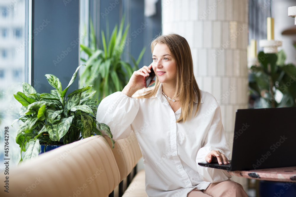 successful business woman sitting in cafe with laptop, working and talking on phone. office workplace with green plants.