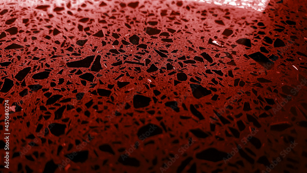 close up red quartz artificial stone with polished surface use as background. red grainy acrylic stone with beautiful pigments use for interior material background. polished dark red granite.