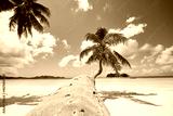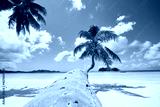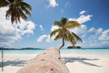 Palm tree on white sand beach. Idyllic day in tropical travel destination. Praslin Island, Seychelles.