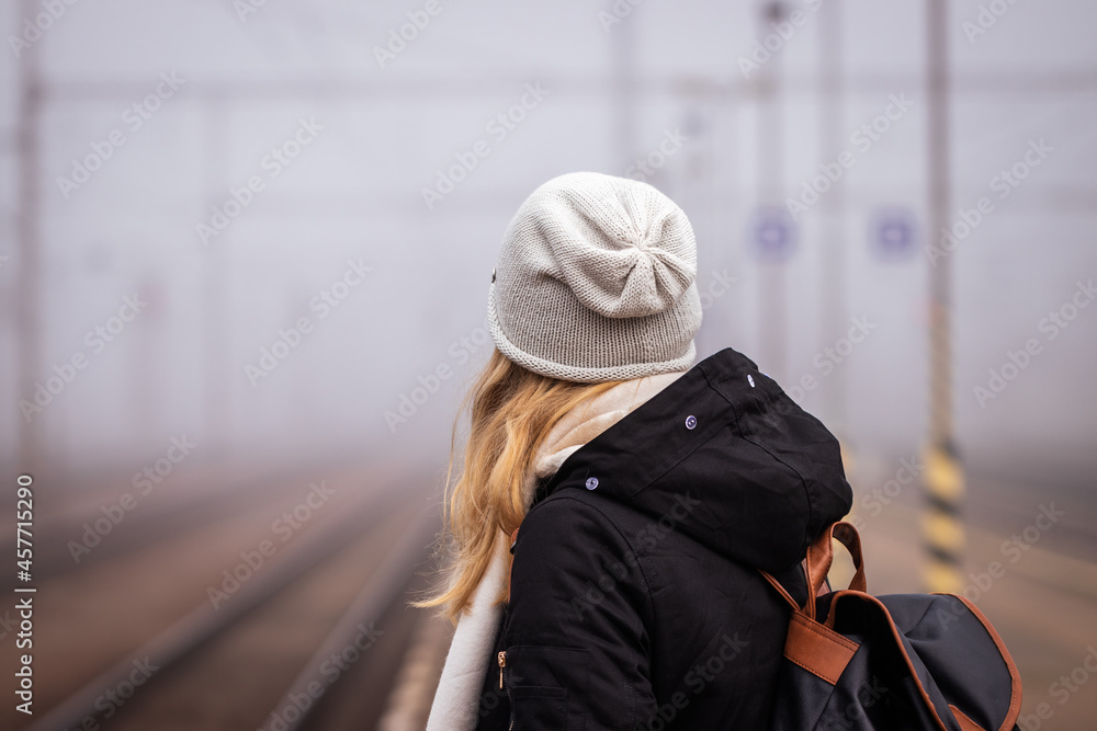 Woman waiting for train on empty railway station at cold foggy morning. Travel by train