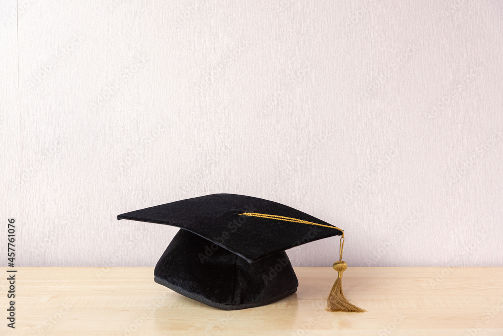 Black academic velvet cap with hanging golden tassel put on wooden table near pastel wall in room. Education for students
