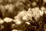 Beautiful pink protea flower against golden fynbos background, in the Southern Cape, South Africa.