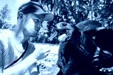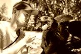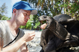 Man with Aldabra giant tortoise in Seychelles. Turtle stretching its long neck for leaf..
