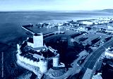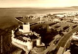 Medieval Norman Castle in Carrickfergus near Belfast in sunrise light. Aerial view with marina, yachts, parking, town and far view of Belfast in the background.