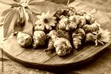 Jerusalem artichoke tubers. Freshly harvested roots of Helianthus tuberosus, also known as sunroot, sunchoke, earth apple, topinambur or lambchoke. Used as a root vegetable.