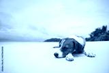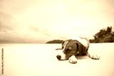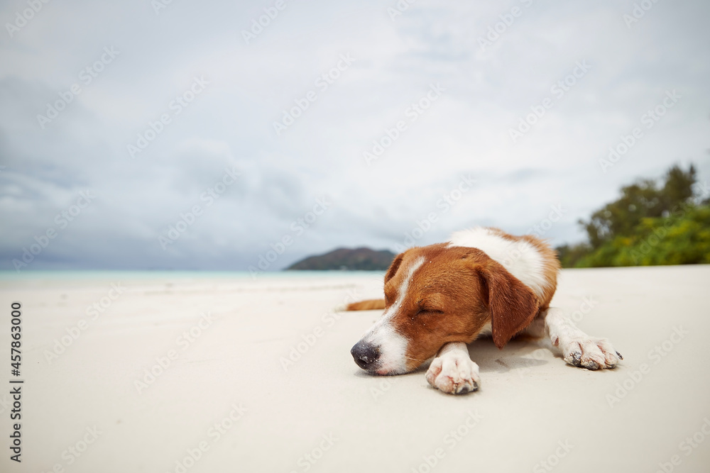 Cute dog sleeping on beautiful white sand beach against sea. .