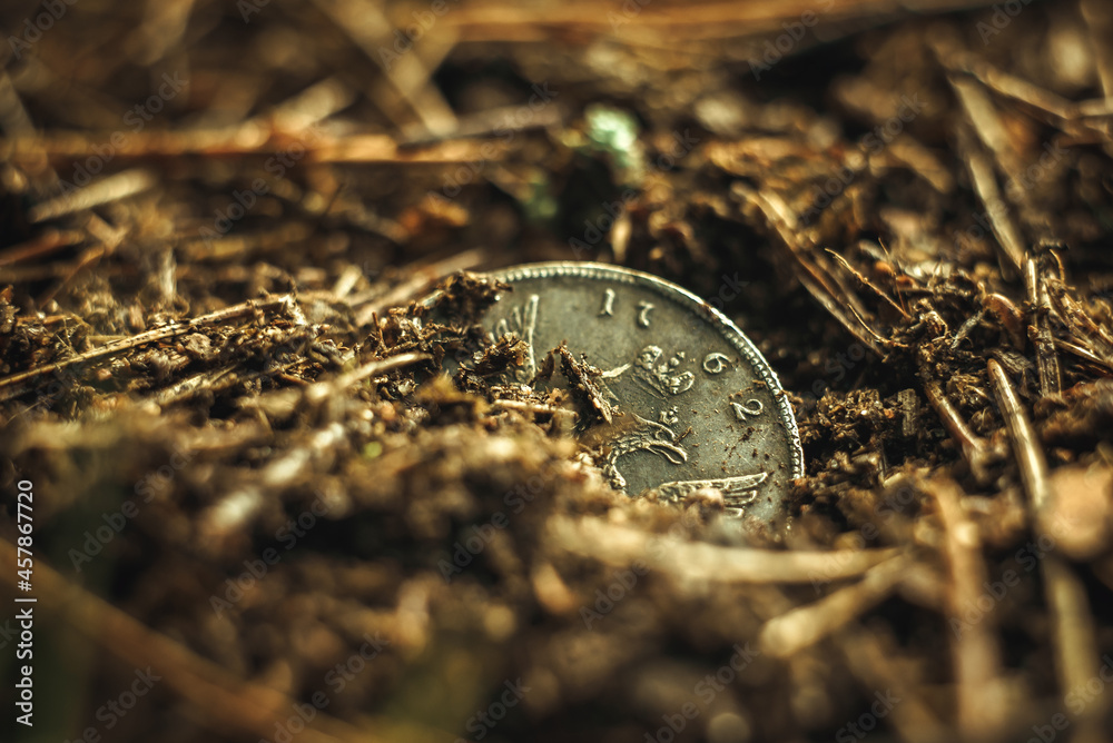 An old silver coin sticks out of the ground. Search for a treasure. Lost treasures.