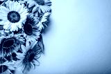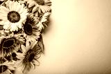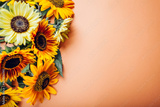 Bunch of yellow orange lime sunflowers on background. Group of fall summer flowers. Space
