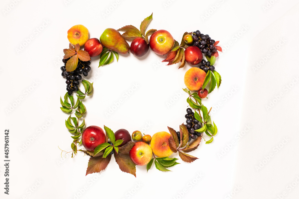 Autumn fruits apples pears grapes fallen leaves lined with frame white background. Thanksgiving harvest concept