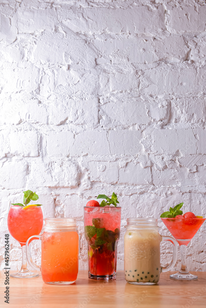 Water melon cocktails with fresh melon and boba bubble tea, on a table over white brick background.