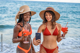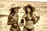 Girlfriends with cocktails and smartphone on beach