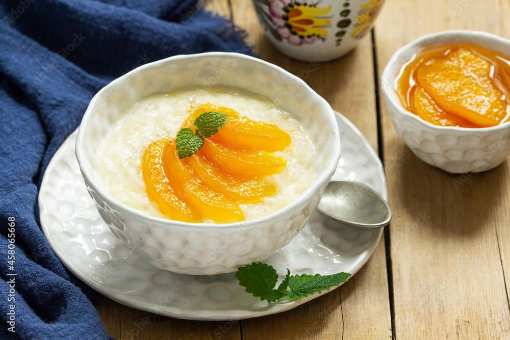 Breakfast of rice porridge with peach jam and tea. Rustic style.