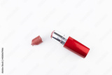 Broken red lipstick and tube on white background
