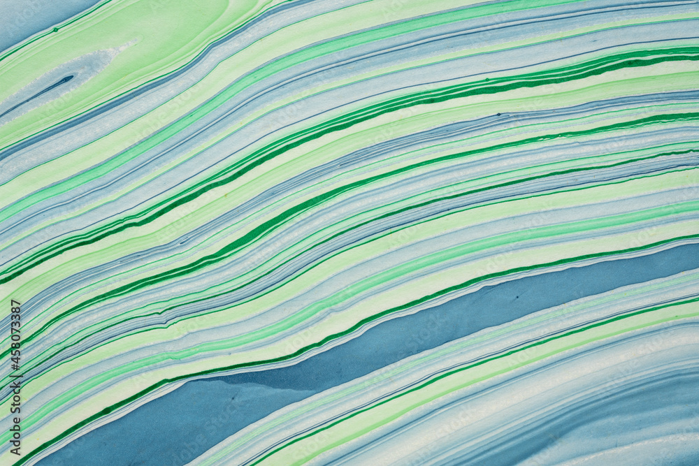 background of handmade Thai marbled mulberry paper in green and blue with flowing pattern