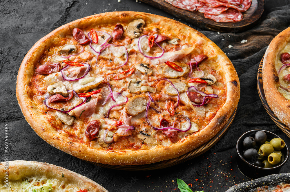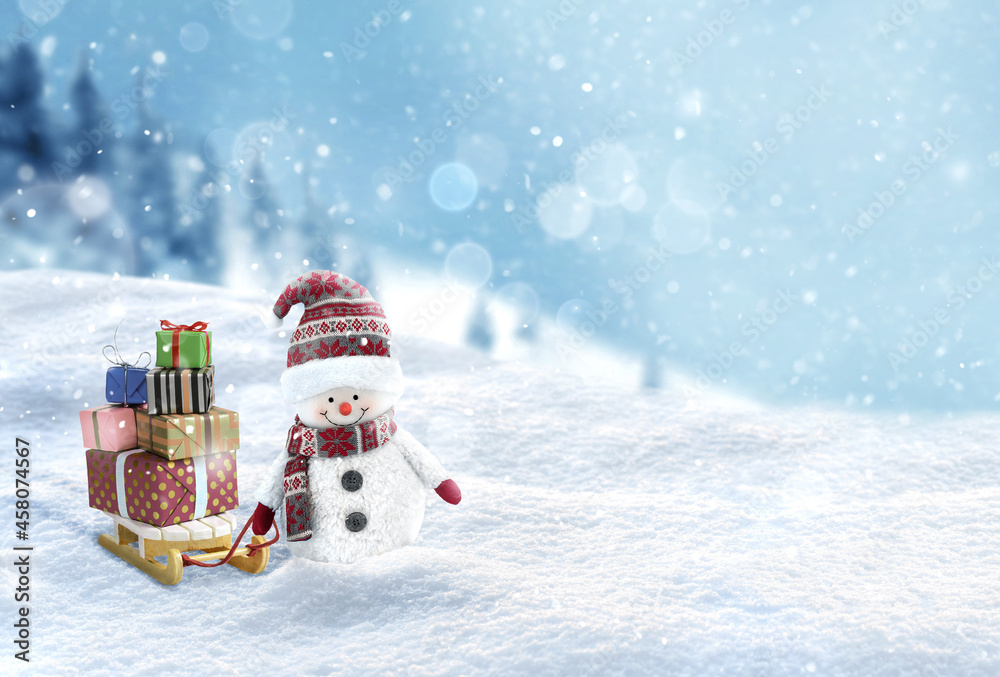 Cute Snowman with gift boxes on the sleigh on snowy landscape background