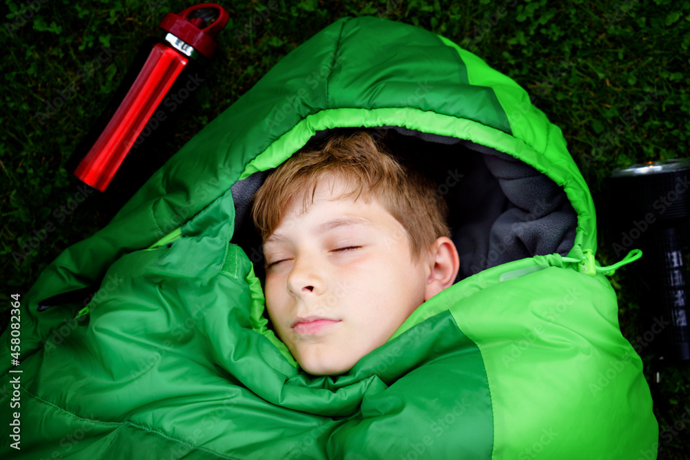 Preteen school kid boy in sleeping bag camping. Outdoors activity with children in summer. Fun and adventure camp, family and friends vacations or weekend trip. Portrait of child with flashlight.