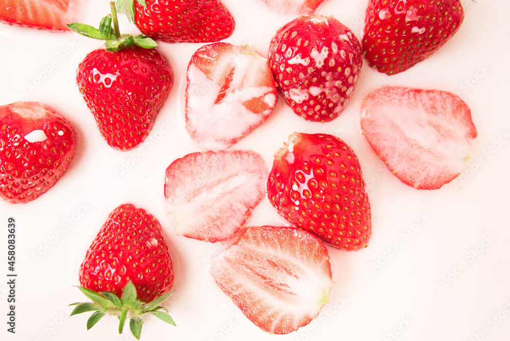 A lot of ripe juicy strawberries in milk, cream or yogurt.