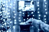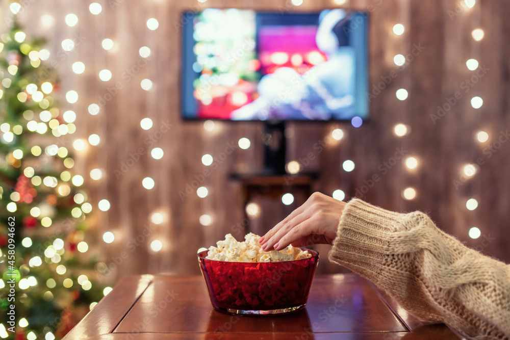 Christmas eve. Alone woman watching tv and eating popcorn. Home cinema. Cropped, close up