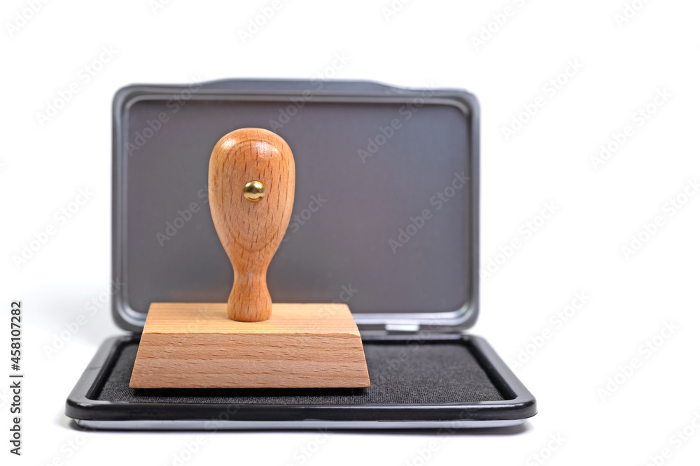 Stempel auf einem Stempelkissen vor weißem Hintergrund