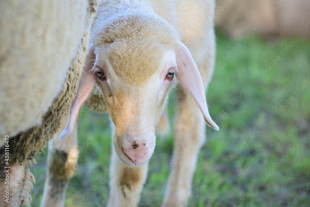 A little white lamb hides behind its mother's body and looks into the camera behind her