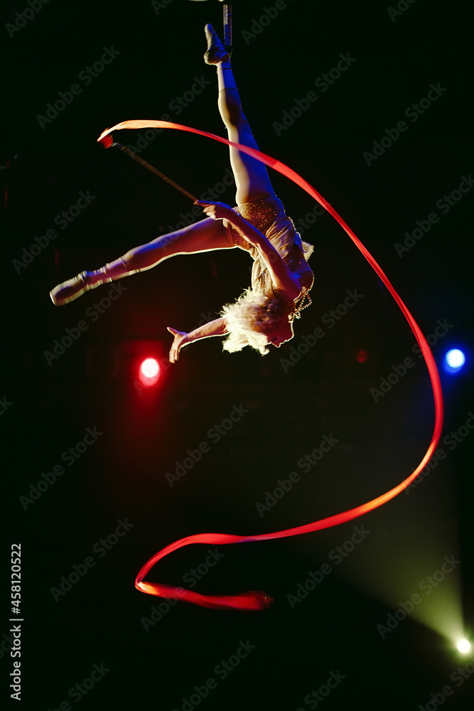 An aerial gymnast shows a performance with a ribbon in the circus arena.