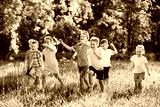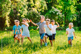 A group of happy children of boys and girls run in the Park on the grass on a Sunny summer day.