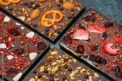 Handmade chocolate bars with a variety of dried fruit and nut toppings.