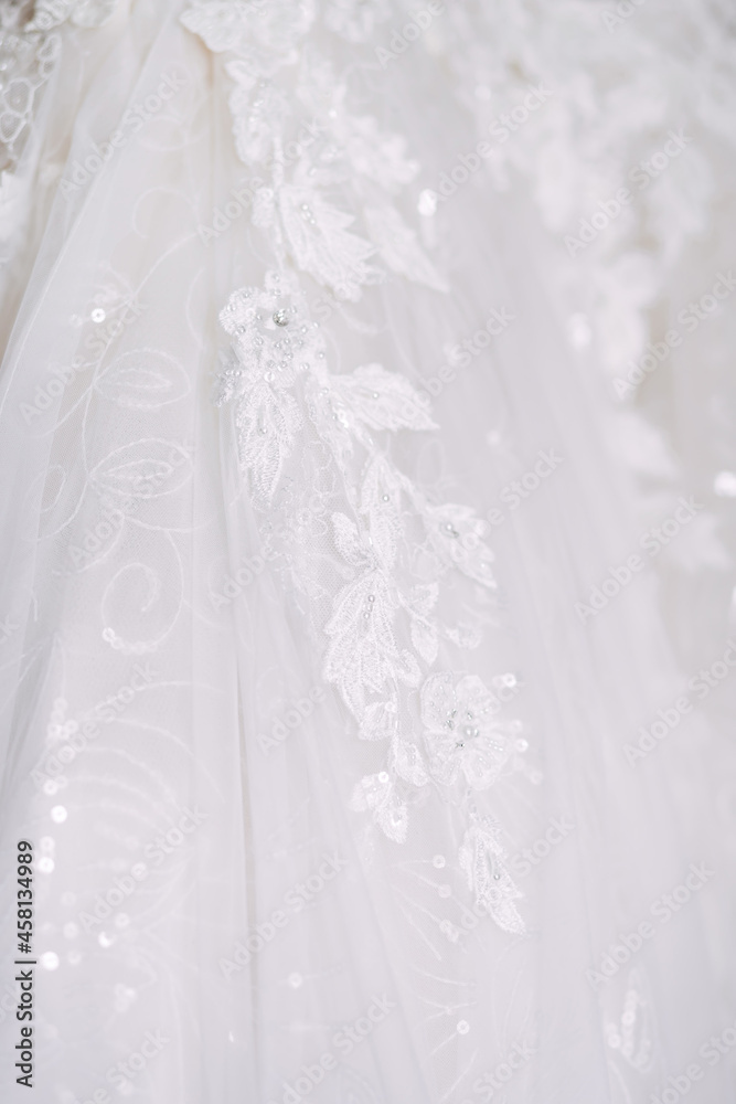 Perfect wedding dress with a fluffy skirt on a hanger in the bride's room.