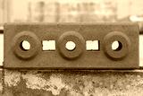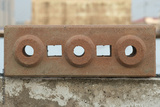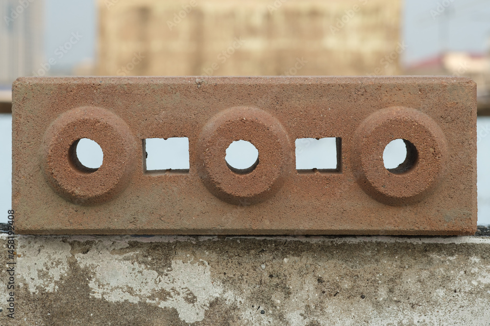 Close up image one red interlocking bricks with holes for garden decoration put isolated on the wall, horizontal view.