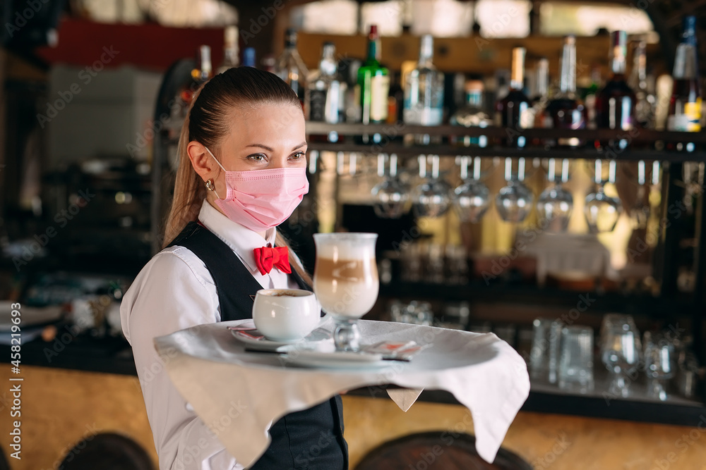 A female Waiter of European appearance in a medical mask serves Latte coffee.