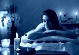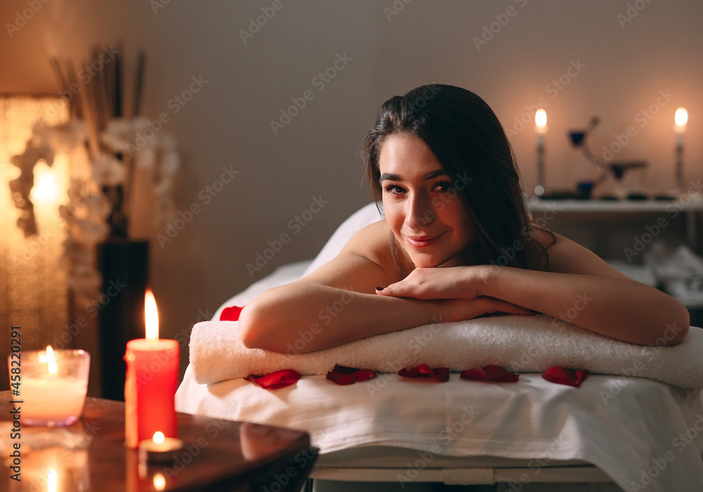 Spa, massage. A young dark-haired beautiful girl is waiting for a massage.
