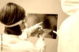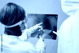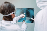 Doctors standing on white background examine x-ray for pneumonia of a Covid-19 patient in the clinic. Coronavirus concept.