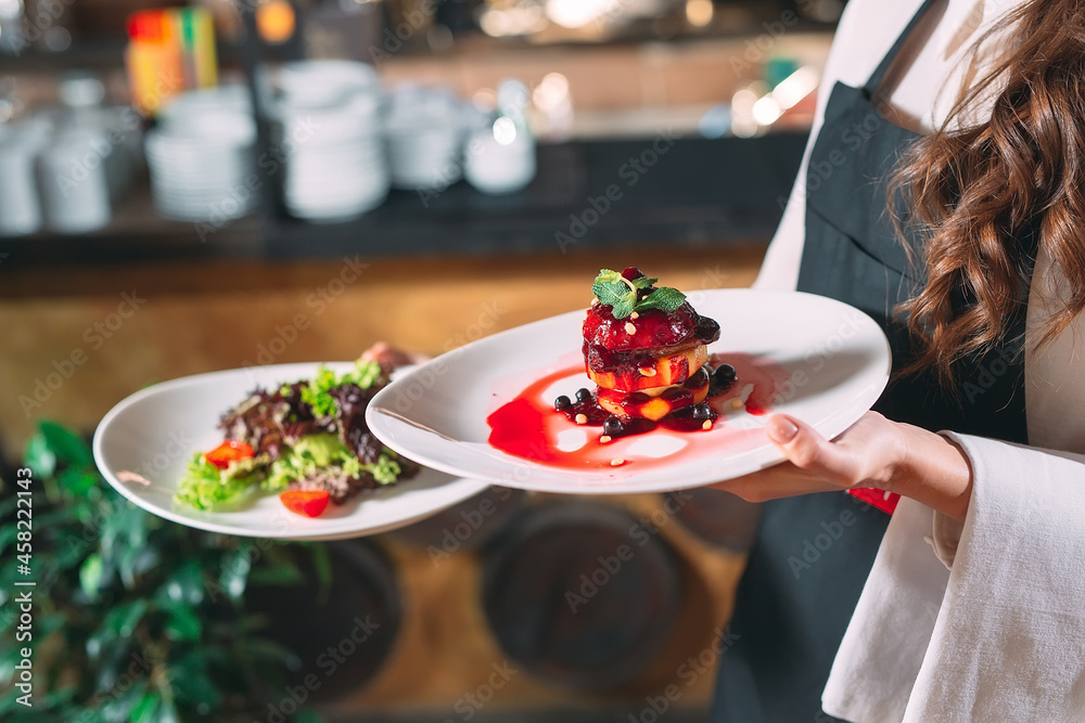 Waiter serving in motion on duty in restaurant. The waiter carries dishes