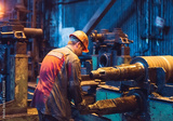 Heavy Industry Worker Working Hard on Machine. Rough Industrial Environment.