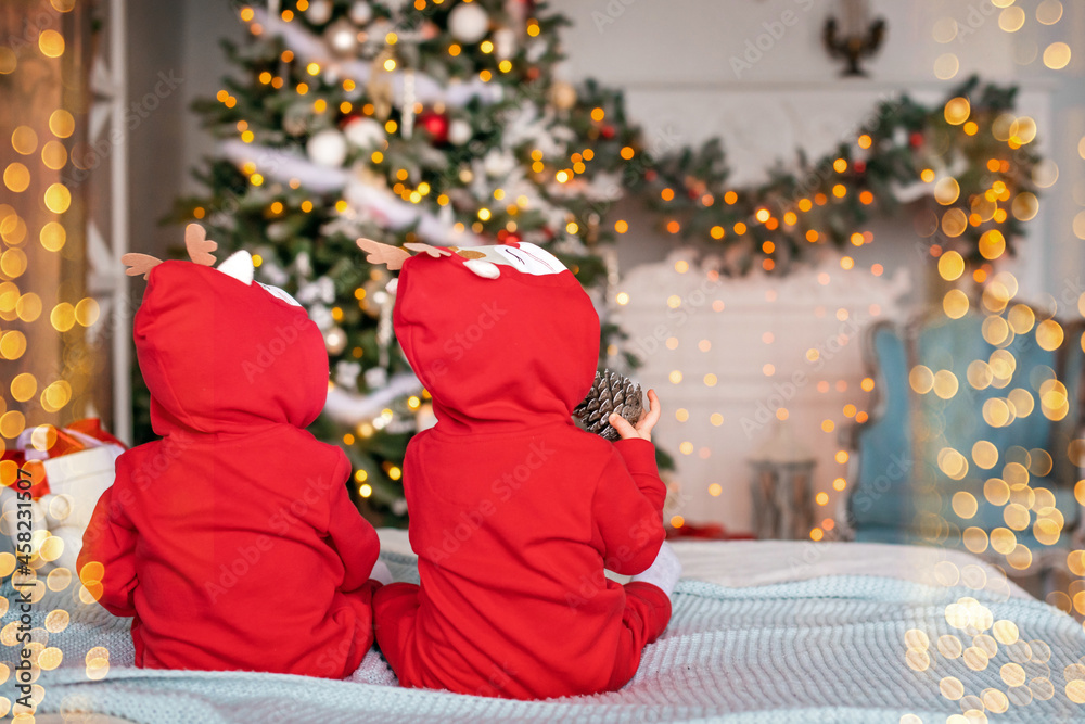 twins toddlers in red santa's reindeer suits sit next to each other at home against the background of christmas tree