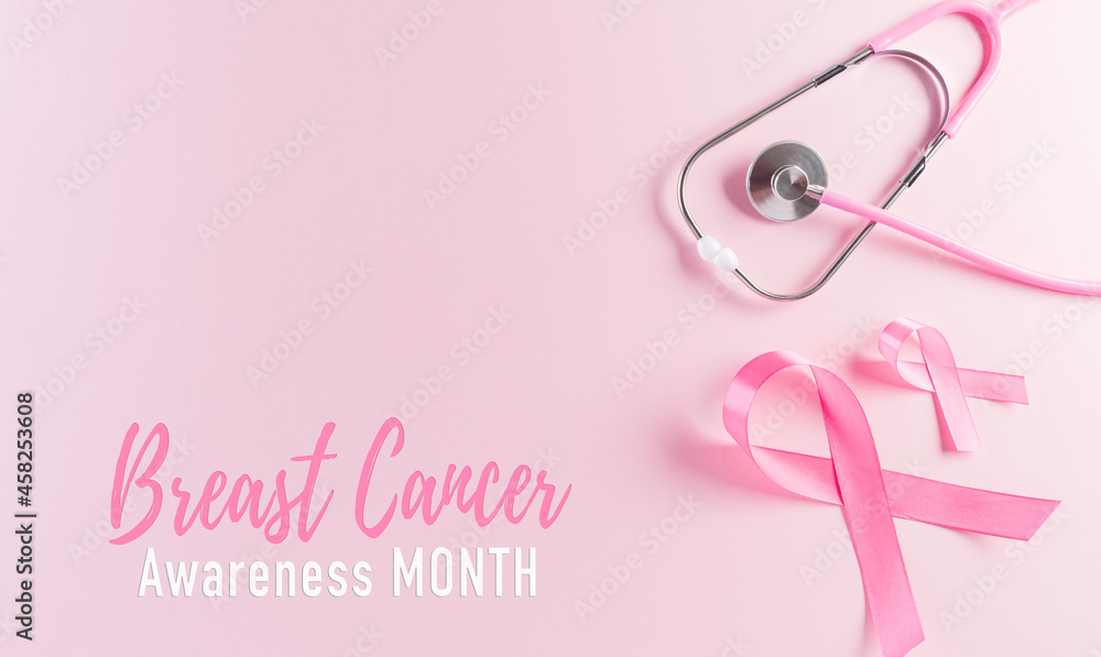 Pink ribbons and stethoscope on pastel background, Symbol of women's breast cancer awareness, Health care and medical concept.