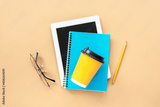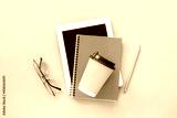 Tablet computer, blue notepad, glasses and yellow coffee cup on the table. Study concept. Top view, flat lay