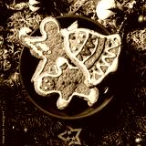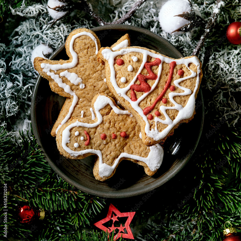 Christmas gingerbread cookies with icing ornate. Xmas decorations, dark background. Top view