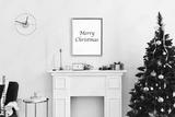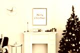Christmas composition with gold mock up poster frame, white chimney and decoration. Christmas trees and wreath, candles, stars, light and elegant accessories. Template.