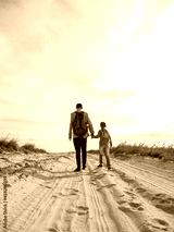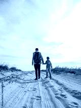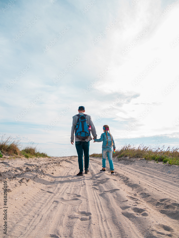 Happy father and daughter running jumping having fun on empty autumn sea beach. Dad and child walking on white sand road with reeds blue sky background. Lifestyle real people. Happiness travel concept