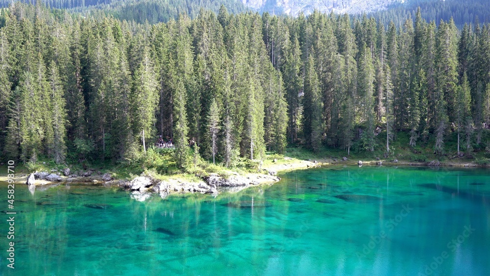 Europe, Italy , Trentino - Lake Lago di Carezza (Karersee Lake ) in Dolomites Catinaccio Mountains - Green clear water and pine wood