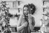 Young beautiful long-haired girl holding a glass of champagne and a sparkler for Christmas holidays.