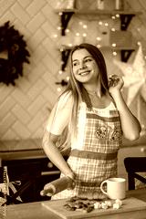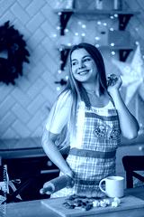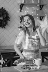 Happy woman prepares Christmas cookies at home. cheerful lady in an apron.