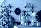 Young woman making shaped cookies for Christmas. The living room is decorated with Christmas tree decorations in the background. Woman in an apron.