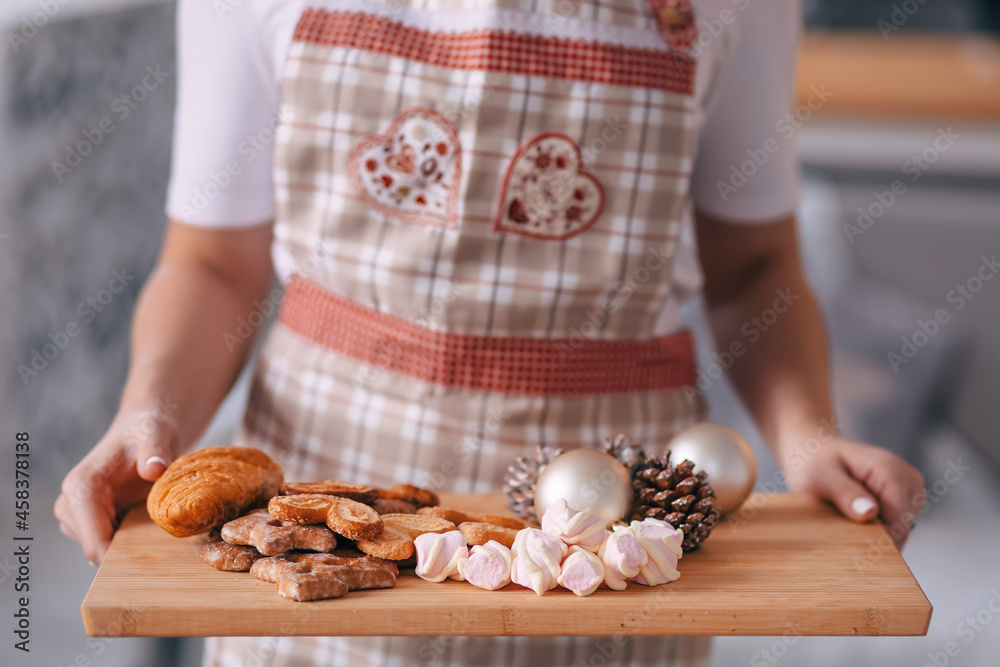 hands of a young girl - a cook in an apron holds a tray with bizet, cookies, toys, croissants. homemade baking
