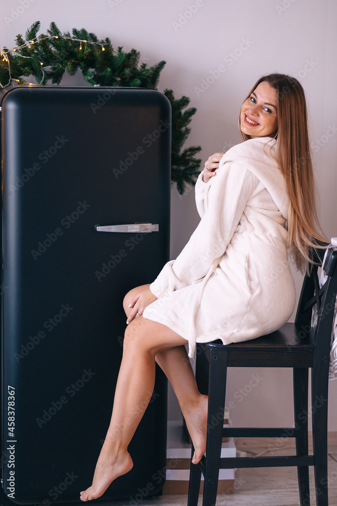 a slender girl at home, sitting on a chair in a warm home robe near a large black refrigerator, decorate with a New Year's wreath