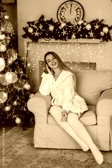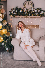 beautiful young girl in long socks near the Christmas tree in sitting in a chair at home. New Year and Christmas theme
