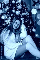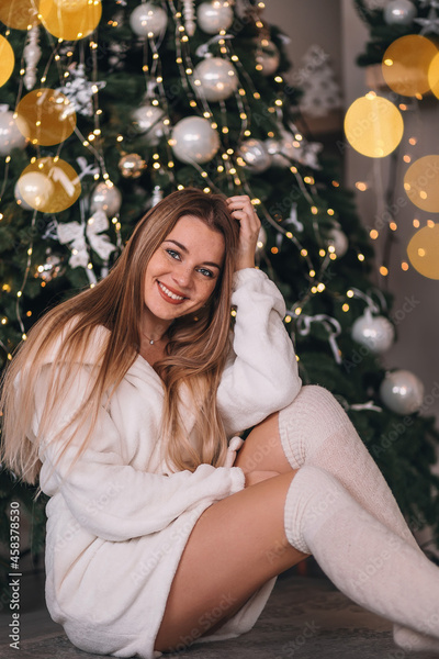 Holidays, celebration, a young woman in a white robe, sits at ho