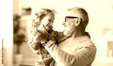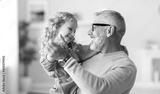 Adorable child girl and positive grandpa holding hands while dancing together in living room